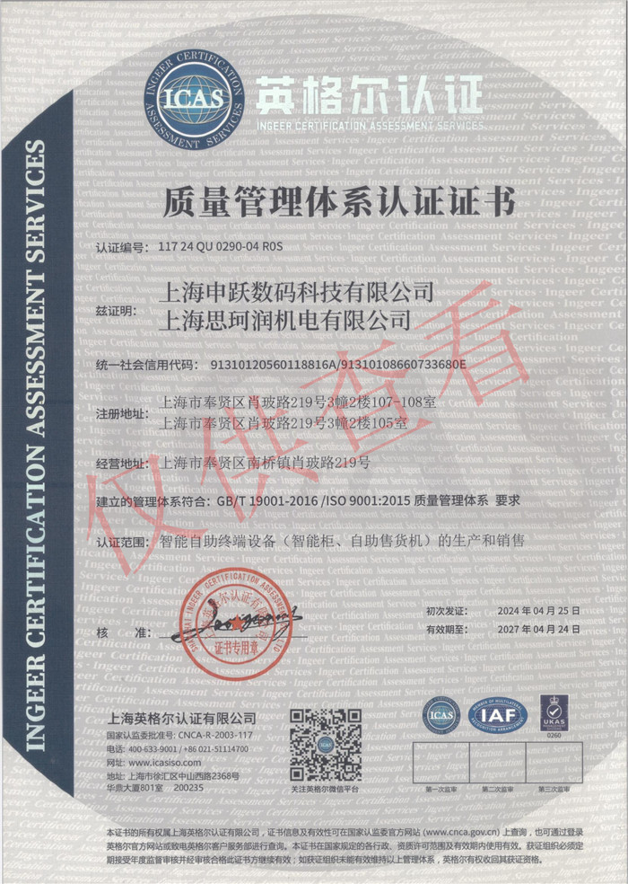 上海思珂潤機電有限公司,成立于2007年是一家以智能自助終端設備(無人售貨機、智能打印機、智能存儲柜等),顯示終端(廣告機、電子閱報欄、拼接屏等)集合數字顯示系統、報業互動多媒體信息發布系統、自助管理應用平臺的產業。公司集研發、設計、生產、售后于一體的集團式生產型企業。集團旗下有上海申躍數碼科技有限公司,上海堃鋌電器制造有限公司,河南凱歌科技產業有限公司,上海適之信息科技有限公司,是具備箱體設計、精工生產、智能應用軟件開發能力的大型集團式生產制造商。公司具備強大的專業設計力量,積極拓展定制業務,為用戶量身定制專業級液晶顯示終端和智能自助終端設備......